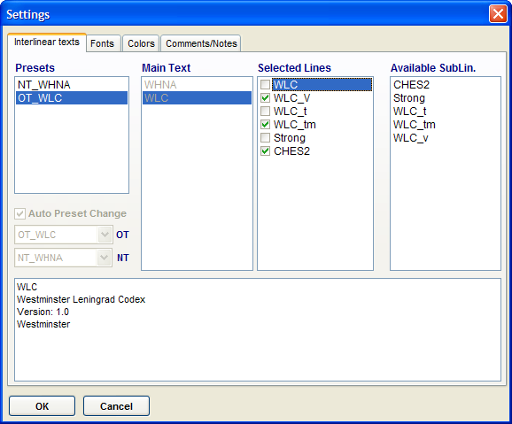 Text is the first line of the interlinear (Greek or Hebrew). Presets